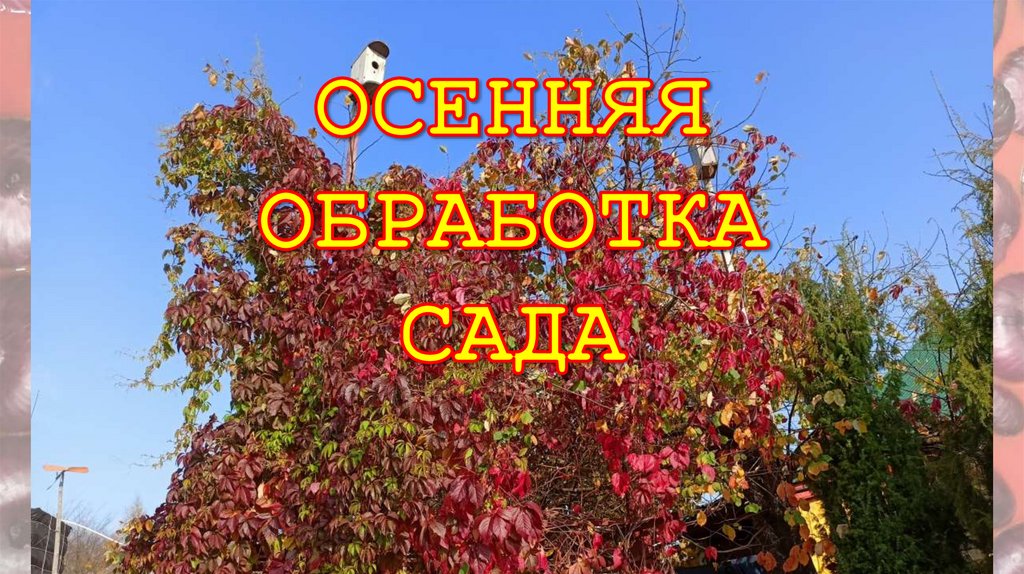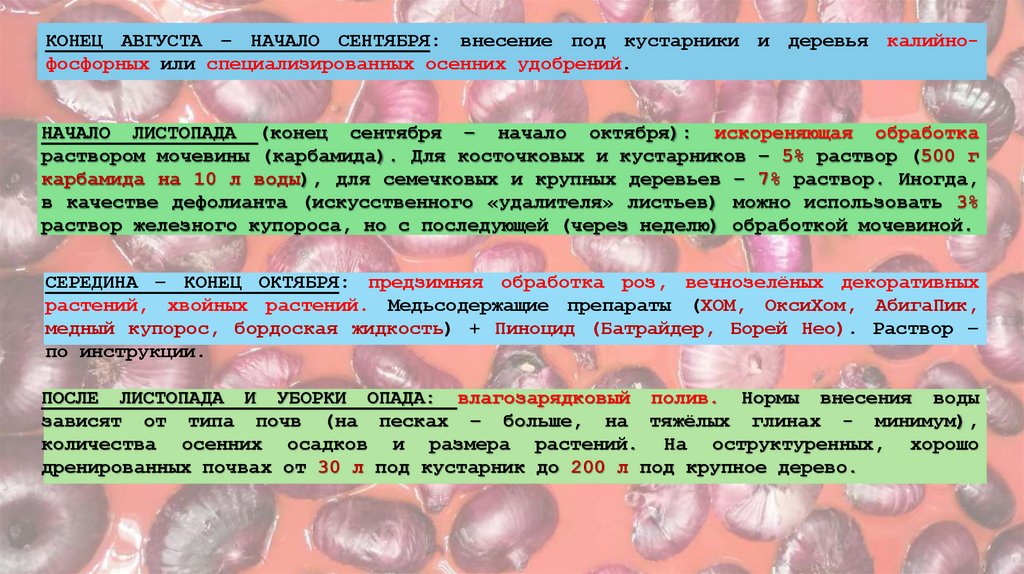 КОНЕЦ АВГУСТА – НАЧАЛО СЕНТЯБРЯ: внесение под кустарники и деревья калийнофосфорных или специализированных осенних удобрений.НАЧАЛО ЛИСТОПАДА (конец сентября – начало октября): искореняющая обработка
