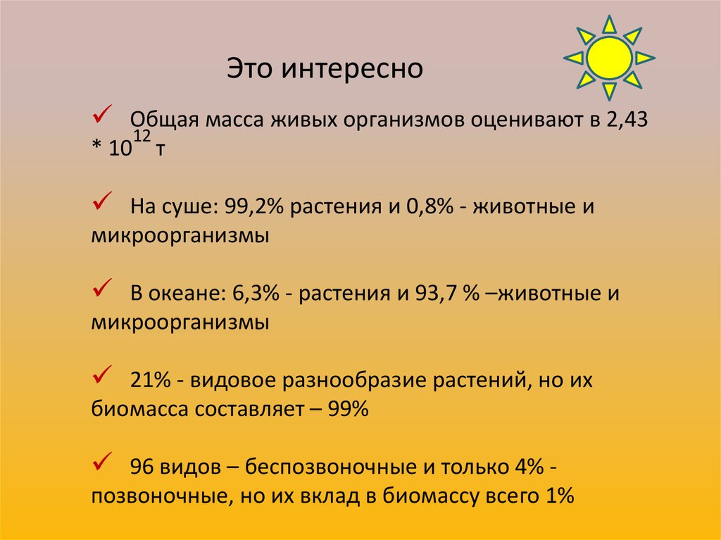 Это интересноОбщая масса живых организмов оценивают в 2,43