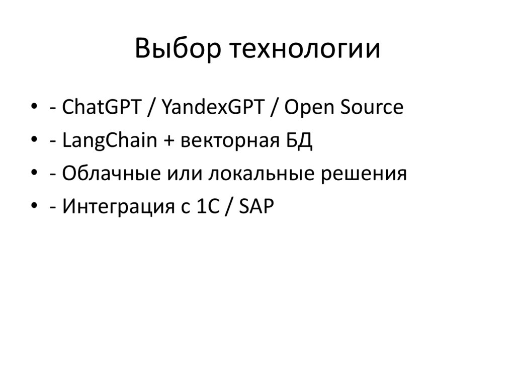 Выбор технологии• - ChatGPT / YandexGPT / Open Source
