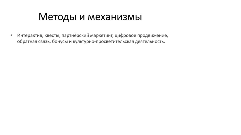 Методы и механизмы• Интерактив, квесты, партнёрский маркетинг, цифровое продвижение,