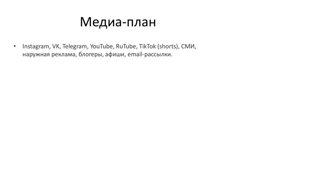 Медиа-план• Instagram, VK, Telegram, YouTube, RuTube, TikTok (shorts), СМИ,