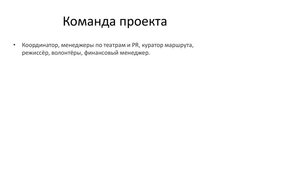 Команда проекта• Координатор, менеджеры по театрам и PR, куратор маршрута,