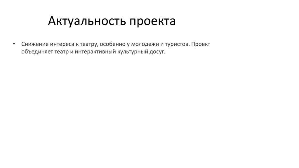 Актуальность проекта• Снижение интереса к театру, особенно у молодежи и туристов. Проект