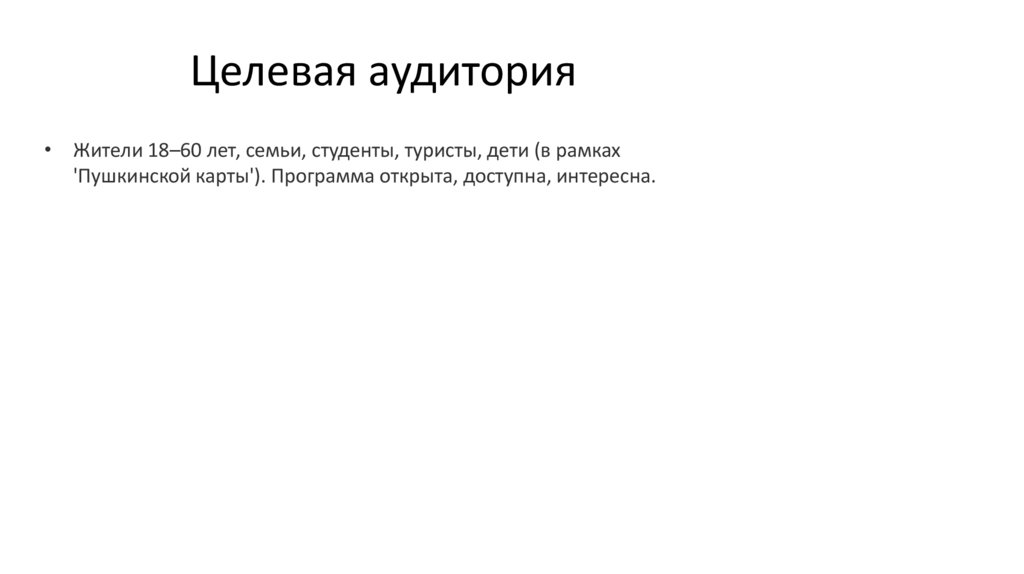 Целевая аудитория• Жители 18–60 лет, семьи, студенты, туристы, дети (в рамках