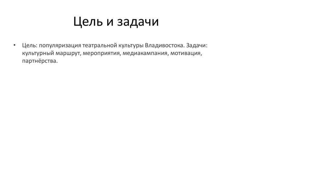Цель и задачи• Цель: популяризация театральной культуры Владивостока. Задачи: