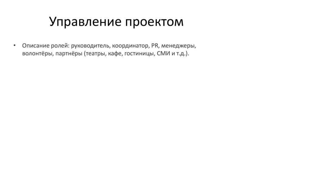 Управление проектом• Описание ролей: руководитель, координатор, PR, менеджеры,