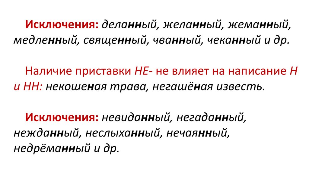 Исключения: деланный, желанный, жеманный,медленный, священный, чванный, чеканный и др.