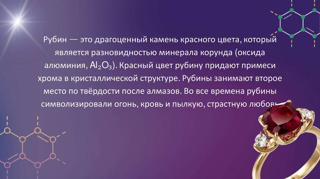 алюминия, Al₂O₃). Красный цвет рубину придают примеси