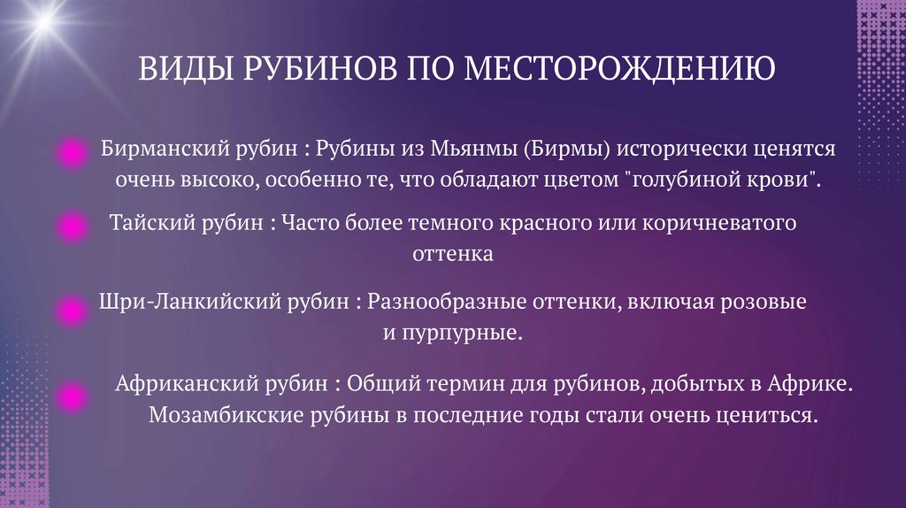 ВИДЫ РУБИНОВ ПО МЕСТОРОЖДЕНИЮБирманский рубин : Рубины из Мьянмы (Бирмы) исторически ценятся