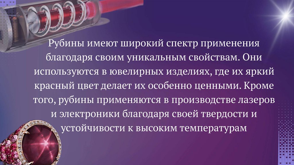 Рубины имеют широкий спектр примененияблагодаря своим уникальным свойствам. Они