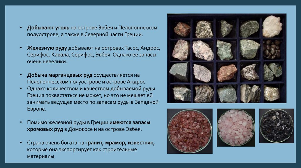 • Добывают уголь на острове Эвбея и Пелопоннескомполуострове, а также в Северной части Греции.