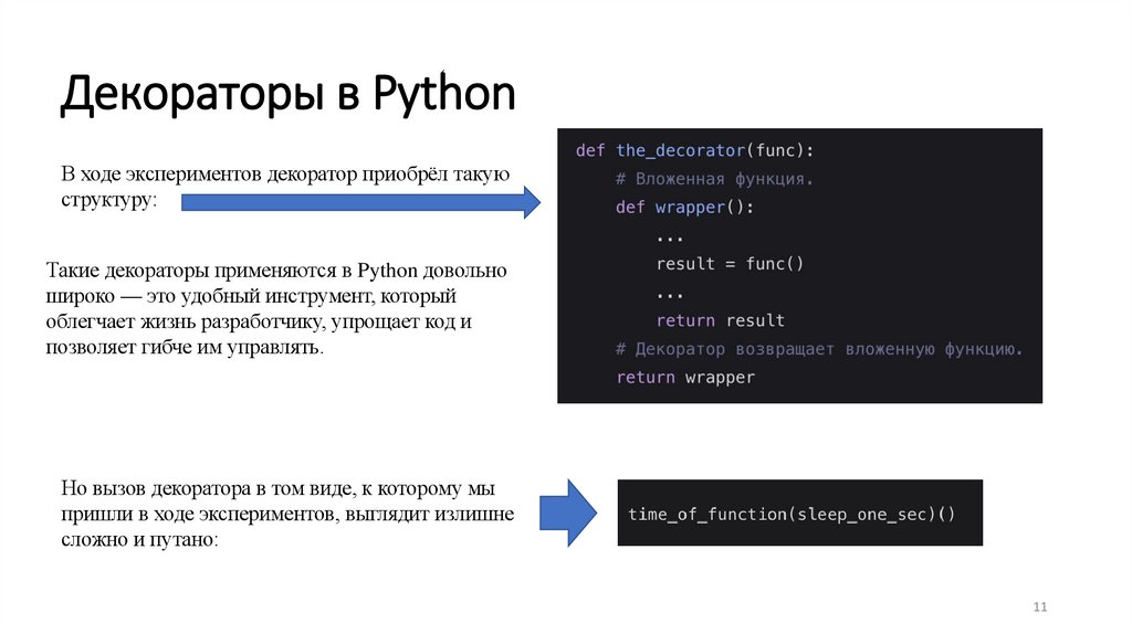Чтобы такой синтаксис работал — в Python есть несколько строгих условий:• в декораторе должна быть вложенная функция,