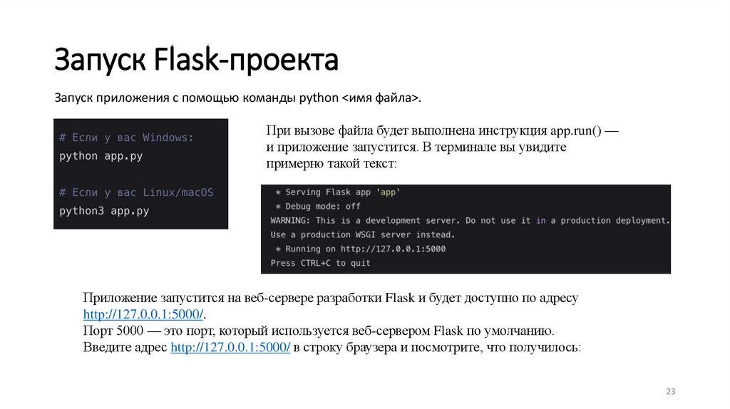 Запуск приложения с помощью команды python <имя файла>.При вызове файла будет выполнена инструкция app.run() —