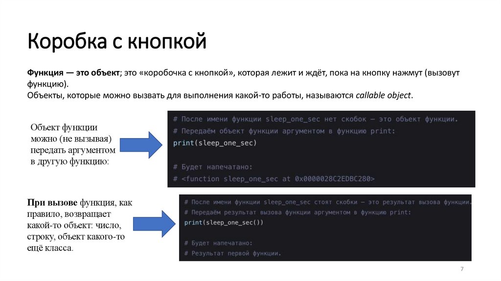 Функция — это объект; это «коробочка с кнопкой», которая лежит и ждёт, пока на кнопку нажмут (вызовутфункцию).