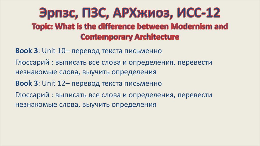 2. Эрпзс, ПЗС, АРХжиоз, ИСС-12 Topic: What is the difference between Modernism and Contemporary Architecture