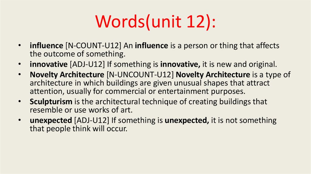 • unexpected [ADJ-U12] If something is unexpected, it is not something