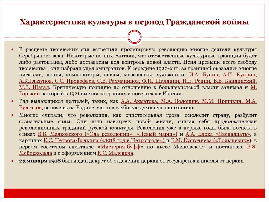 В расцвете творческих сил встретили пролетарскую революцию многие деятели культурыСеребряного века. Некоторые из них считали, что отечественные культурные традиции будут