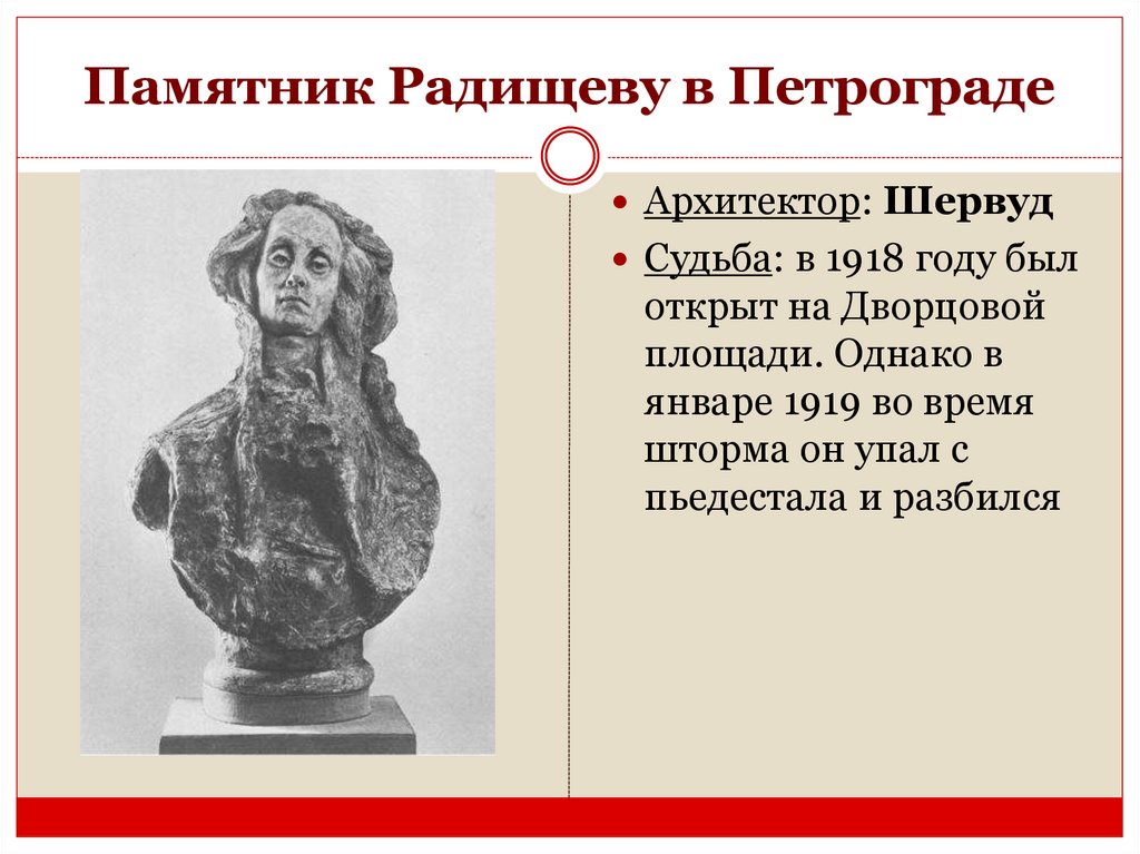 Первым был сооружен памятник А.Н. Радищеву в Петрограде (скульптор Л.В. Шервуд).
