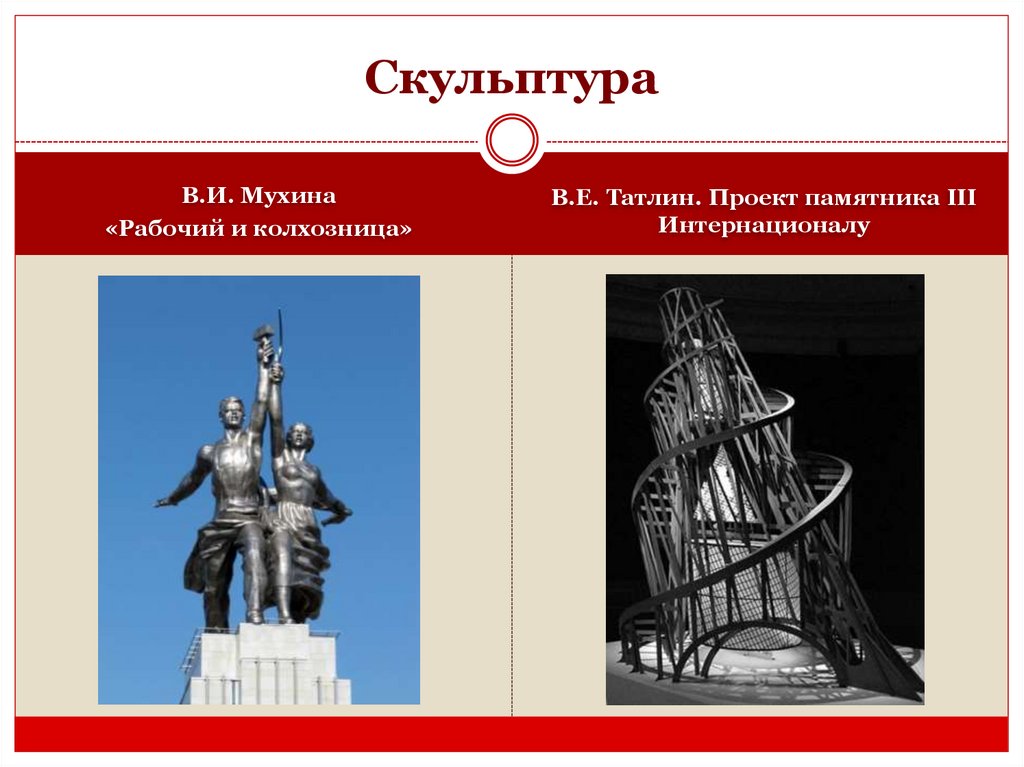В 1937 В.И. Мухина создала скульптурную группу «Рабочий и колхозница» для павильона