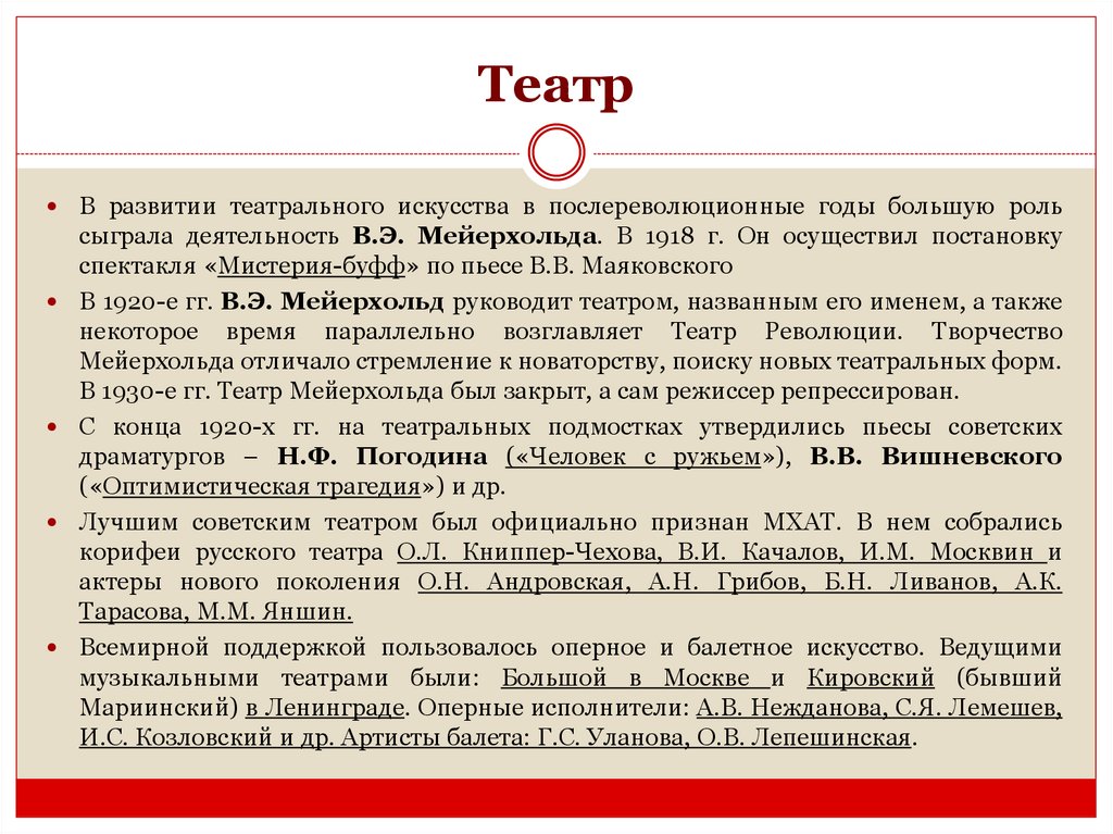 В развитии театрального искусства в послереволюционные годы большую рольсыграла деятельность В.Э. Мейерхольда. В 1918 г. Он осуществил постановку