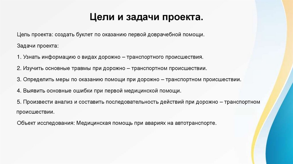 Цель проекта: создать буклет по оказанию первой доврачебной помощи.Задачи проекта:
