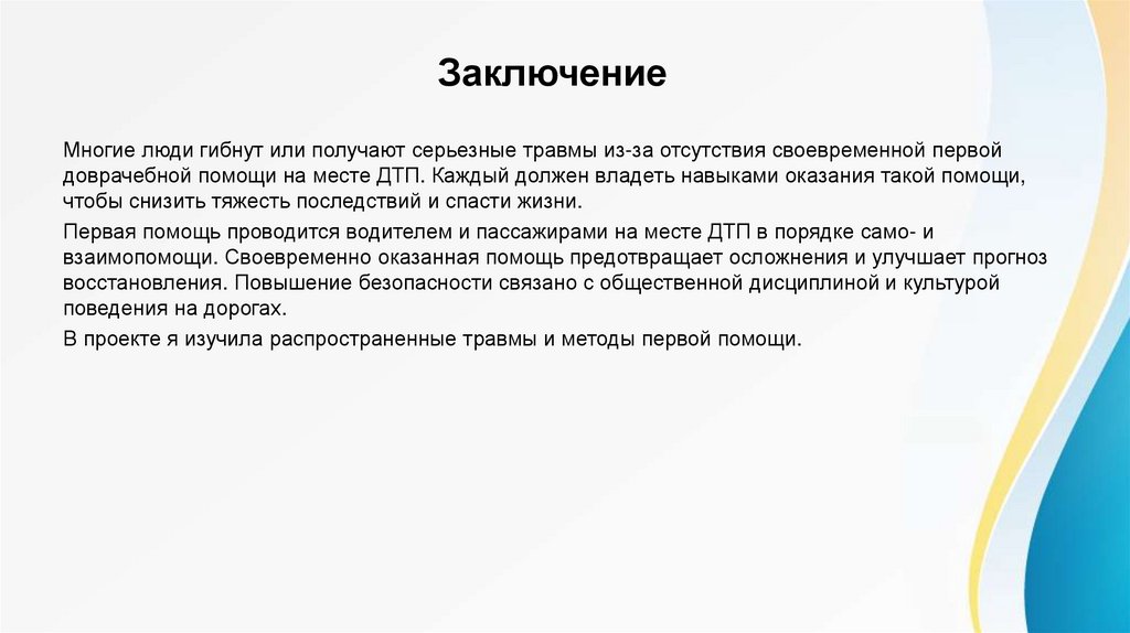 Многие люди гибнут или получают серьезные травмы из-за отсутствия своевременной первойдоврачебной помощи на месте ДТП. Каждый должен владеть навыками оказания такой помощи,