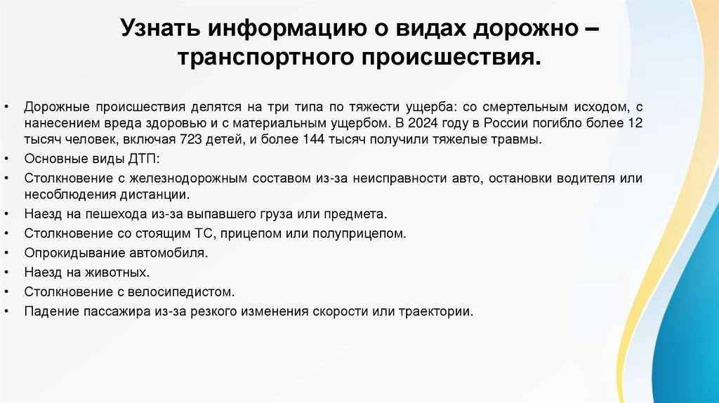 1. Узнать информацию о видах дорожно – транспортного происшествия.