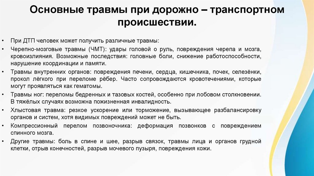 При ДТП человек может получить различные травмы:
