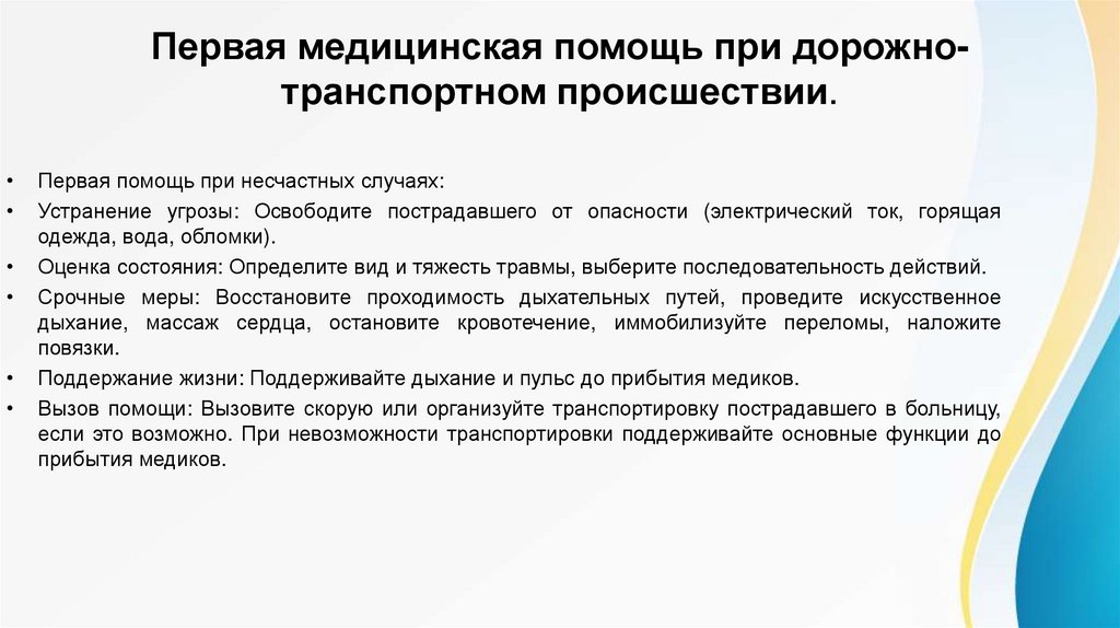 Первая медицинская помощь при дорожнотранспортном происшествии.Первая помощь при несчастных случаях:
