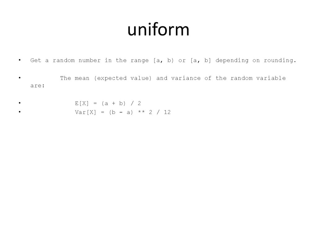 uniformGet a random number in the range [a, b) or [a, b] depending on rounding.