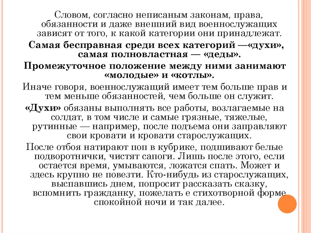 Словом, согласно неписаным законам, права,обязанности и даже внешний вид военнослужащих