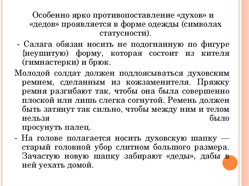 Особенно ярко противопоставление «духов» и«дедов» проявляется в форме одежды (символах