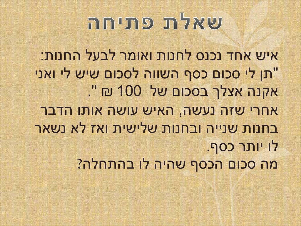איש אחד נכנס לחנות ואומר לבעל החנות:"תן לי סכום כסף השווה לסכום שיש לי ואני