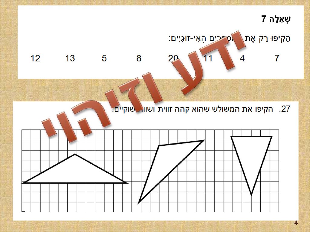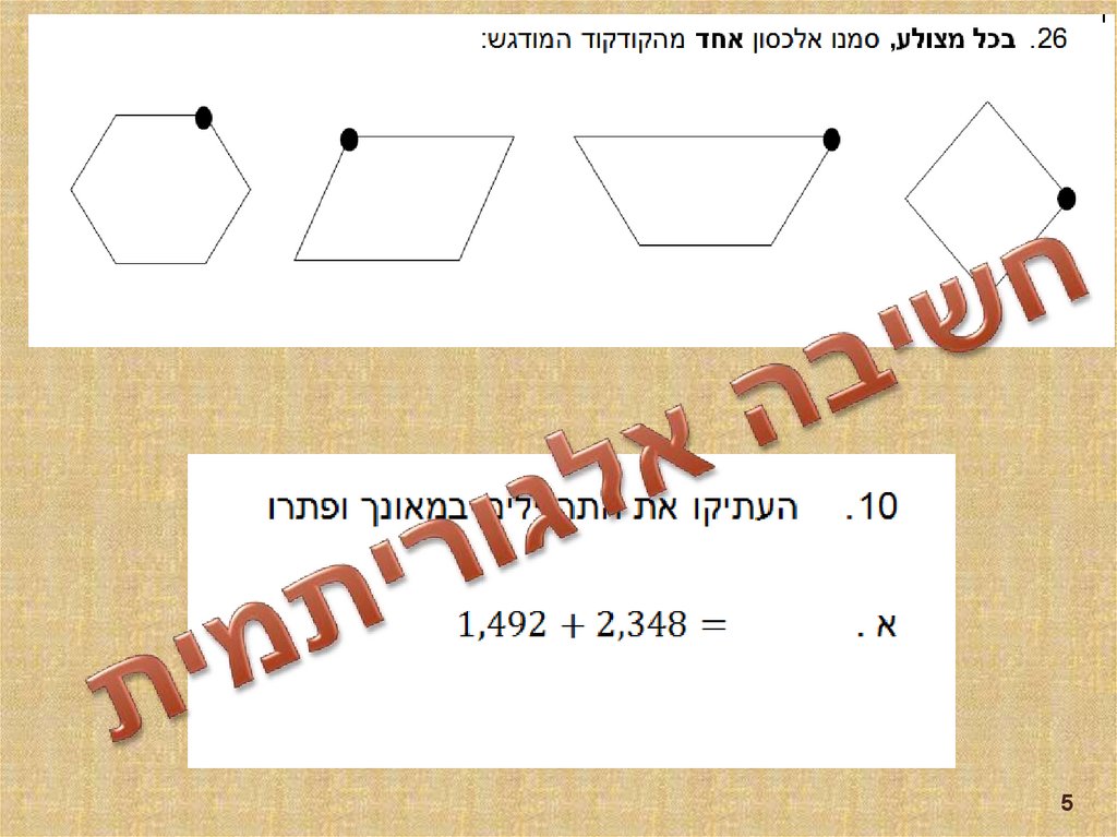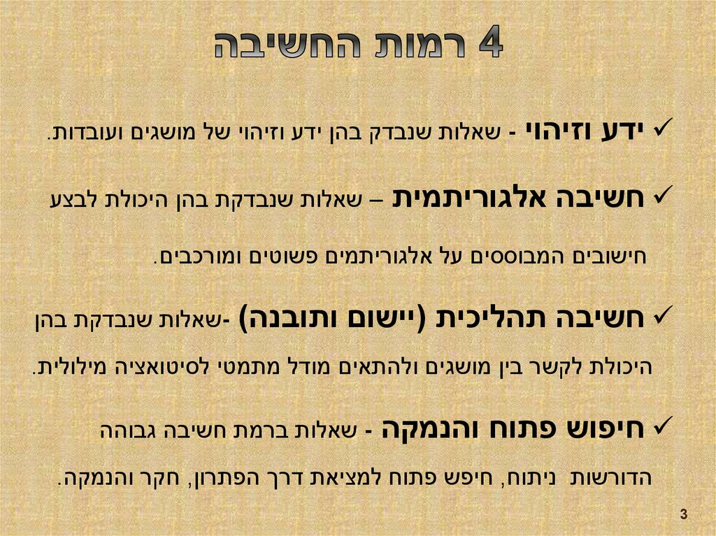 ידע וזיהוי -שאלות שנבדק בהן ידע וזיהוי של מושגים ועובדות. חשיבה אלגוריתמית – שאלות שנבדקת בהן היכולת לבצע