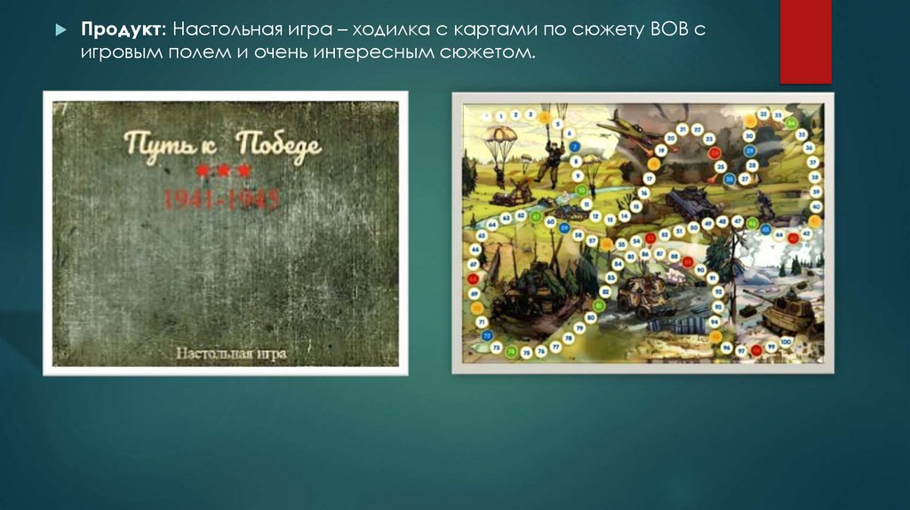 Продукт: Настольная игра – ходилка с картами по сюжету ВОВ сигровым полем и очень интересным сюжетом.