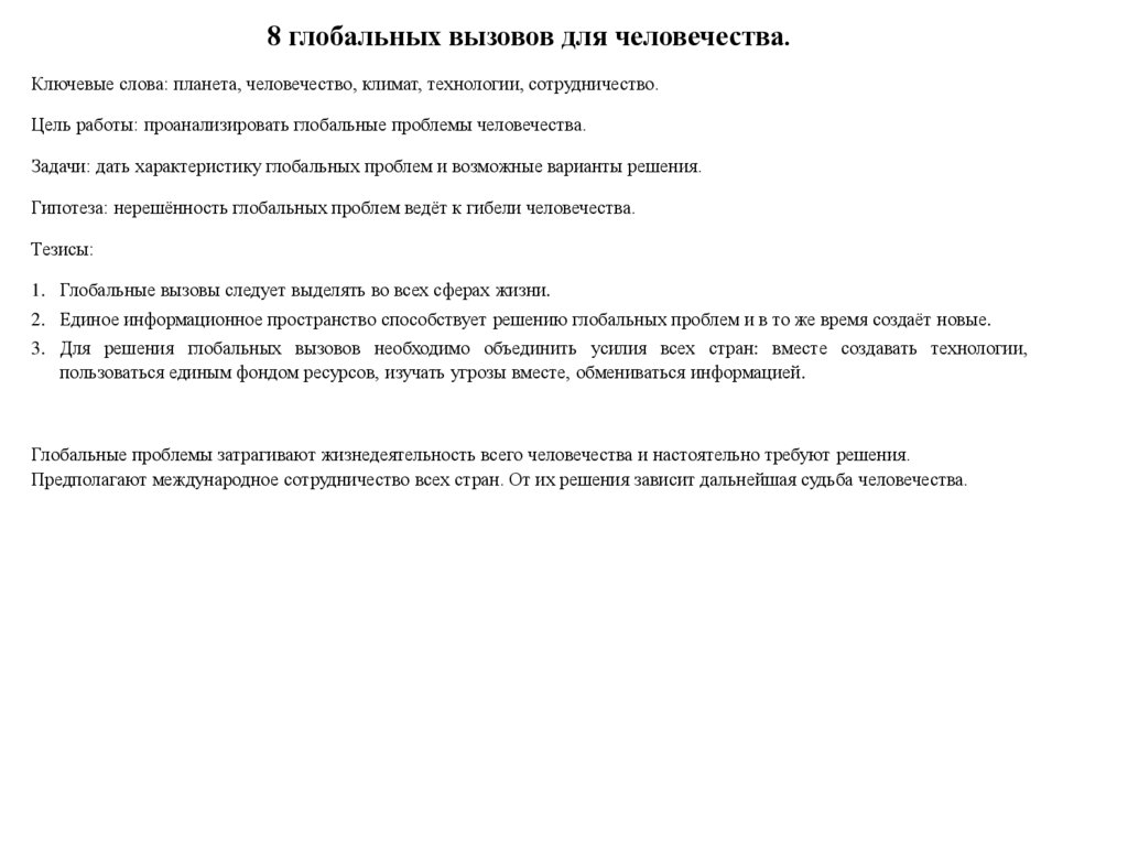 8 глобальных вызовов для человечества.Ключевые слова: планета, человечество, климат, технологии, сотрудничество.