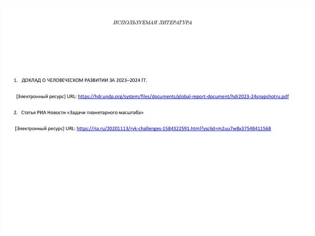ИСПОЛЬЗУЕМАЯ ЛИТЕРАТУРА1. ДОКЛАД О ЧЕЛОВЕЧЕСКОМ РАЗВИТИИ ЗА 2023–2024 ГГ.