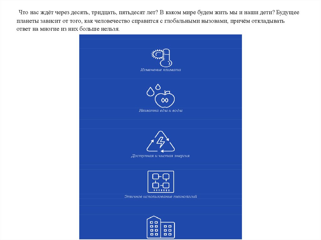 Что нас ждёт через десять, тридцать, пятьдесят лет? В каком мире будем жить мы и наши дети? Будущеепланеты зависит от того, как человечество справится с глобальными вызовами, причём откладывать