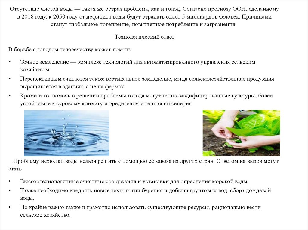 Отсутствие чистой воды — такая же острая проблема, как и голод. Согласно прогнозу ООН, сделанномув 2018 году, к 2050 году от дефицита воды будут страдать около 5 миллиардов человек. Причинами