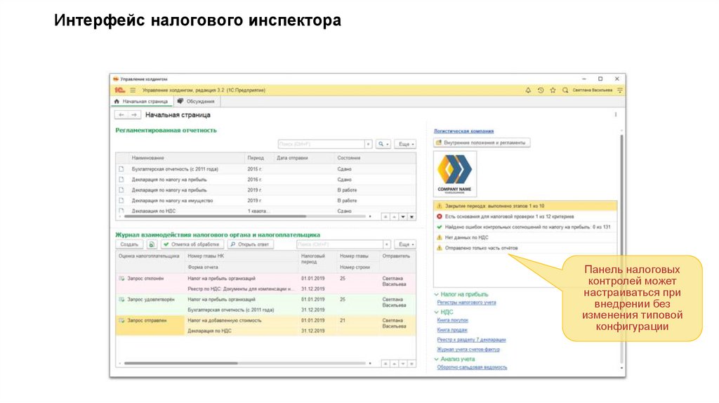 Панель налоговых контролей можетнастраиваться при внедрении без