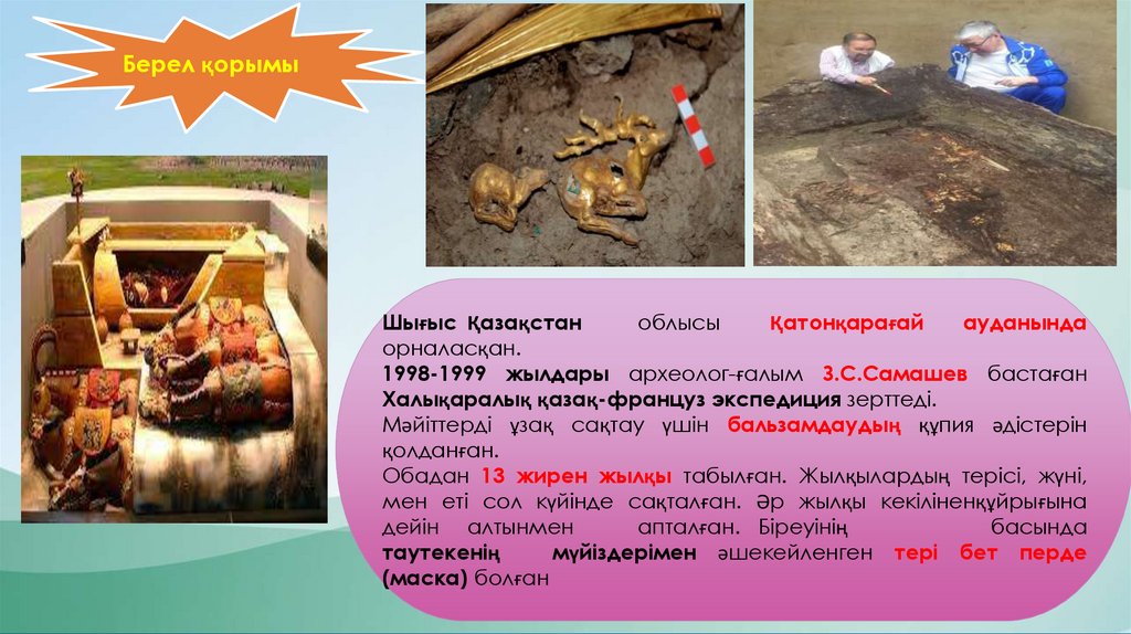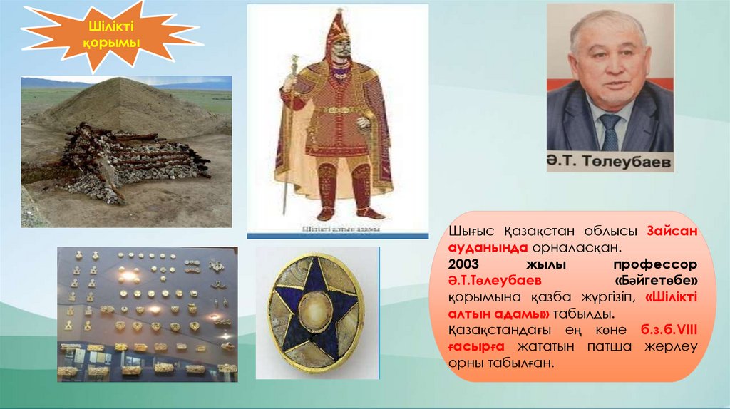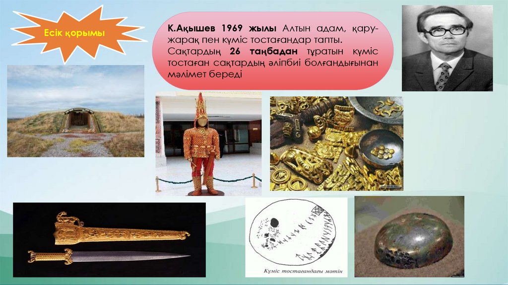 Есік қорымыК.Ақышев 1969 жылы Алтын адам, қаружарақ пен күміс тостағандар тапты.