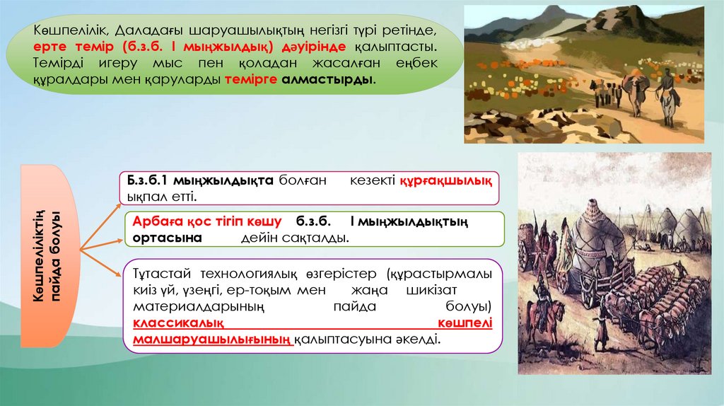 Көшпелілік, Даладағы шаруашылықтың негізгі түрі ретінде,ерте темір (б.з.б. I мыңжылдық) дәуірінде қалыптасты.