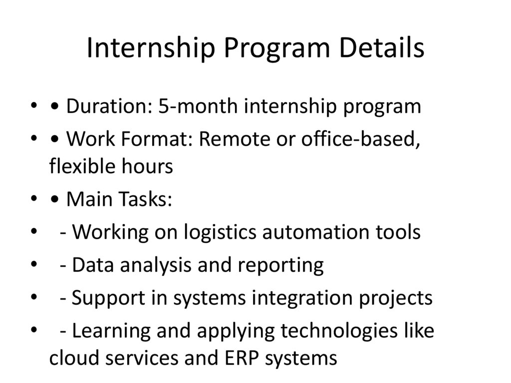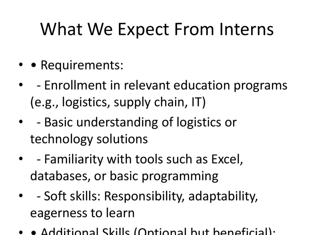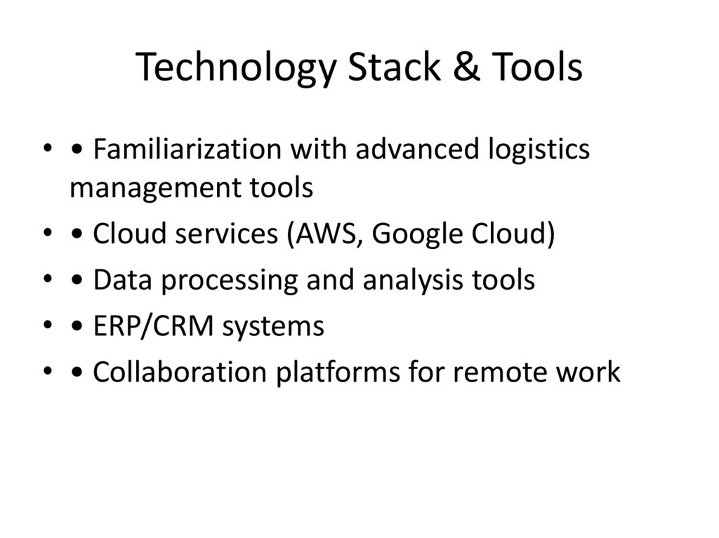 Technology Stack & Tools• • Familiarization with advanced logistics