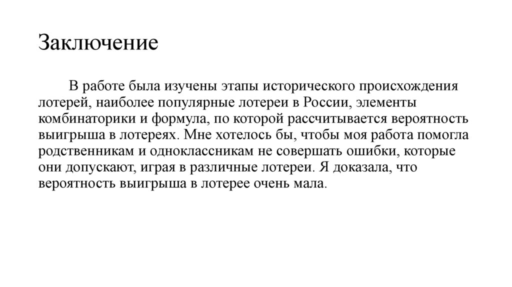 Цель: Доказать то, что вероятность выигрыша в лотерее очень мала.1. Изучить исторические этапы происхождения лотерей.