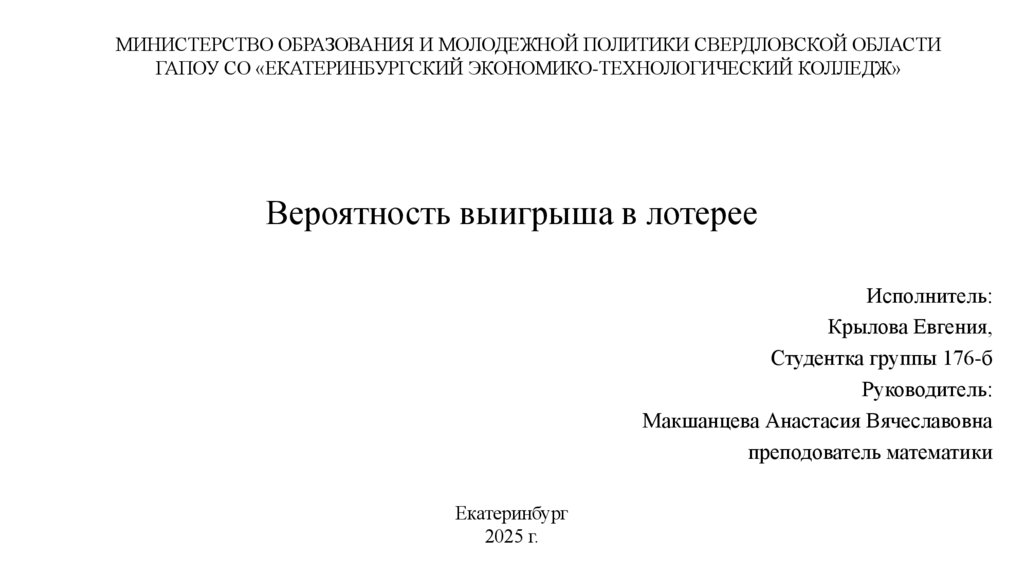 МИНИСТЕРСТВО ОБРАЗОВАНИЯ И МОЛОДЕЖНОЙ ПОЛИТИКИ СВЕРДЛОВСКОЙ ОБЛАСТИГАПОУ СО «ЕКАТЕРИНБУРГСКИЙ ЭКОНОМИКО-ТЕХНОЛОГИЧЕСКИЙ КОЛЛЕДЖ»