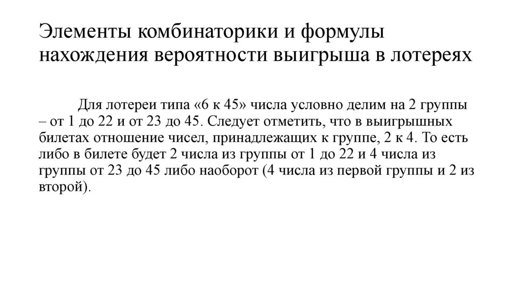 Для лотереи типа «6 к 45» числа условно делим на 2 группы