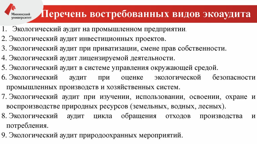 Перечень востребованных видов экоаудита1. Экологический аудит на промышленном предприятии.