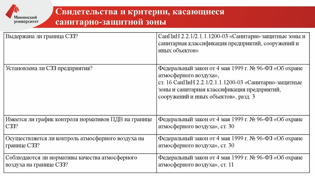 Свидетельства и критерии, касающиесясанитарно-защитной зоны