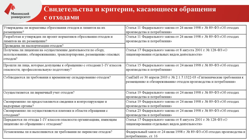 Свидетельства и критерии, касающиеся обращенияс отходами