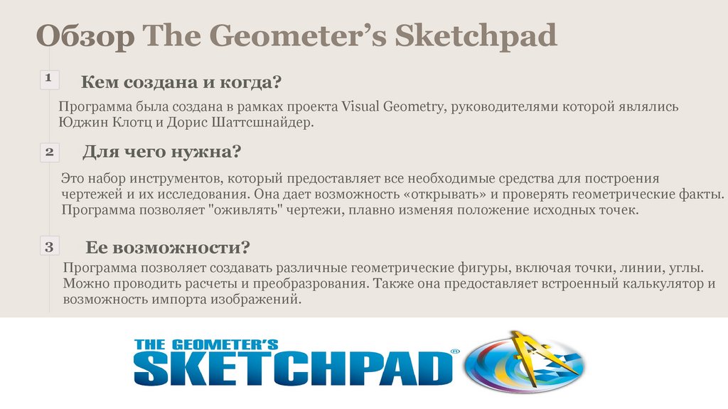 чертежей и их исследования. Она дает возможность «открывать» и проверять геометрические факты.